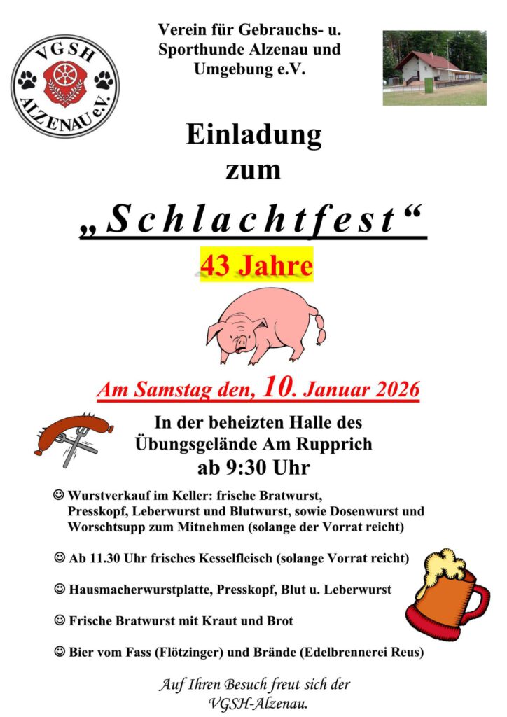 Und es ist mal wieder so weit, am 10.01.2026 findet wieder unser traditionelles Schlachtfest statt mit vielen Wurst Spezialitäten, wie Bratwurst, Kesselfleisch, Wurstplatten, Verkauf von Leberwurst, Blutwurst, Bratwurst und Presskopp im Darm und in Dosen.